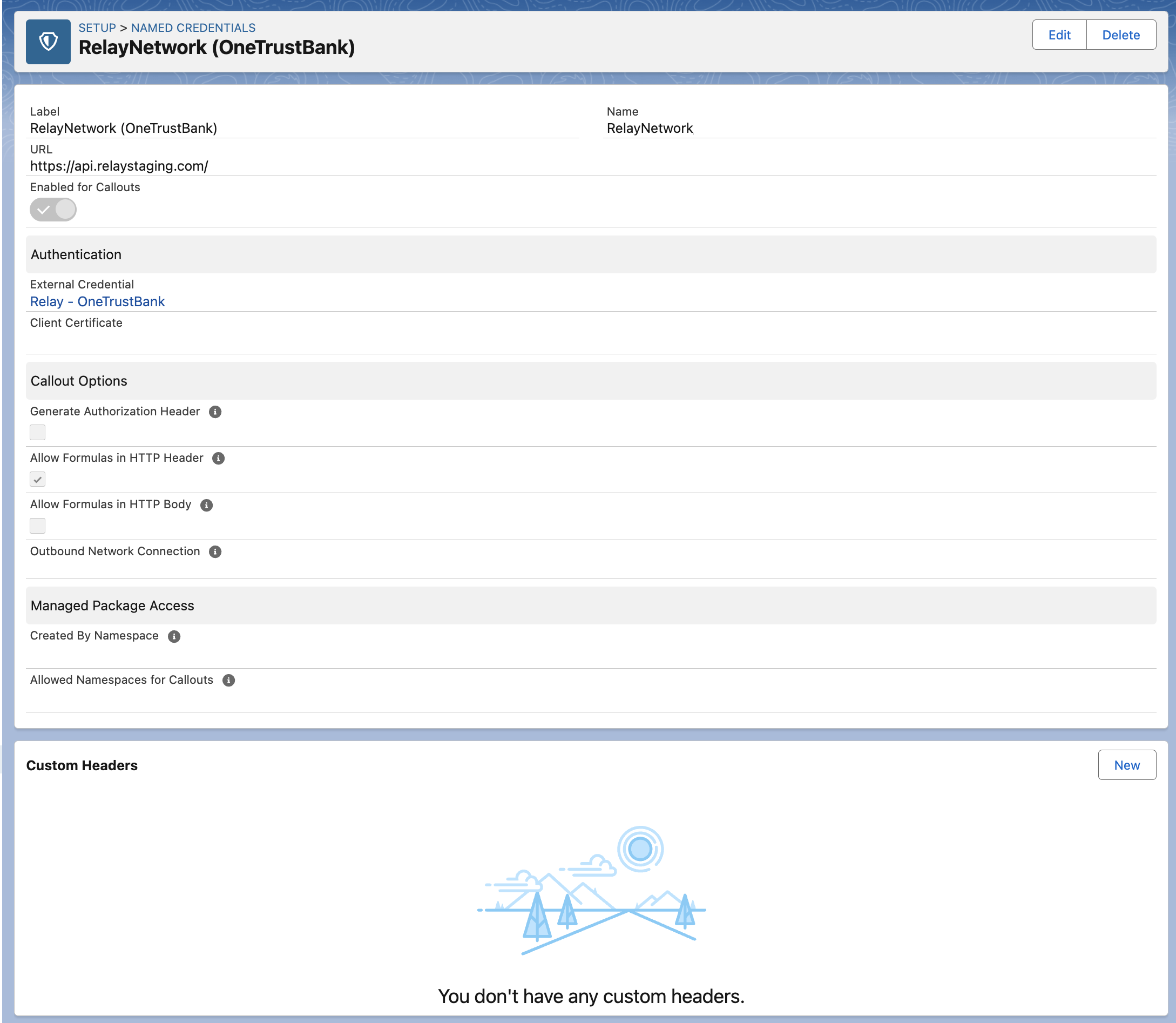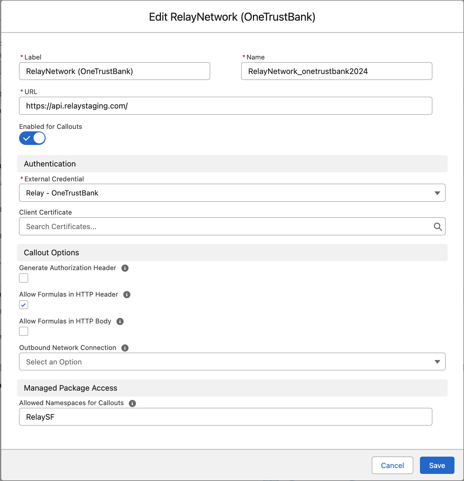 To establish a connection between the Relay Salesforce package and the Relay Network platform, configuration of an External Credential and Named Credential is necessary.