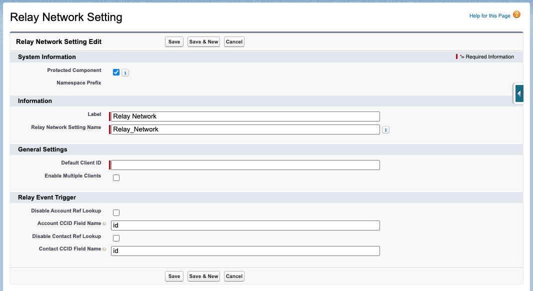 Disable Contact Ref Lookup | When enabled (unchecked), the Relay Event Trigger will try to link the Relay Event record with an Account record. Please ensure that the Account CCID Field Name is correctly configured in the section above. When disabled (checked), no contact lookup will occur, and the Contact__c field on the Relay Event record will remain null. |
